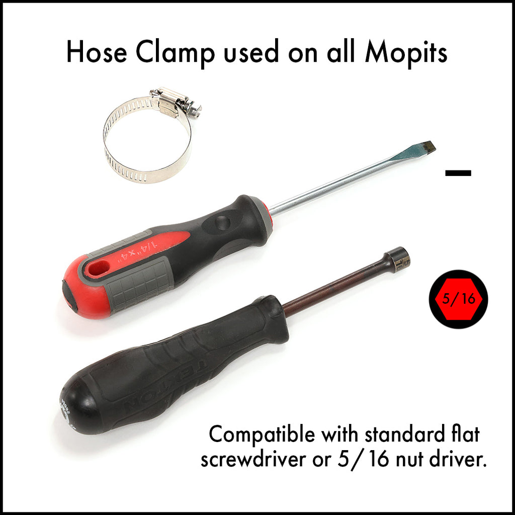 This is a #20 stainless steel hose clamp for use on all Mopit models. This is the clamp used for the drain hose and the squeegee hose. You can use a flat head screwdriver or a 5/16" socket to loosen or tighten it.