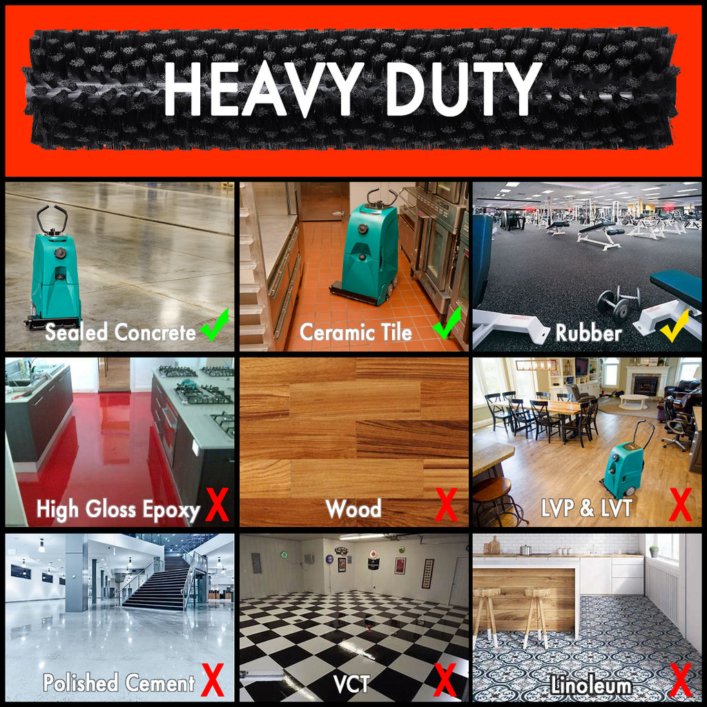 This brush does not have the standard bristles. It is a little coarser for heavier soiled areas on sealed concrete and ceramic tile. DO NOT use on softer flooring materials, such as wood or glossy and polished surfaces. The coarseness of the bristles has the potential to damage and mar these types of surfaces. For flooring types other than sealed concrete, ceramic tile and rubber a Light or Medium Duty Brush should be used.