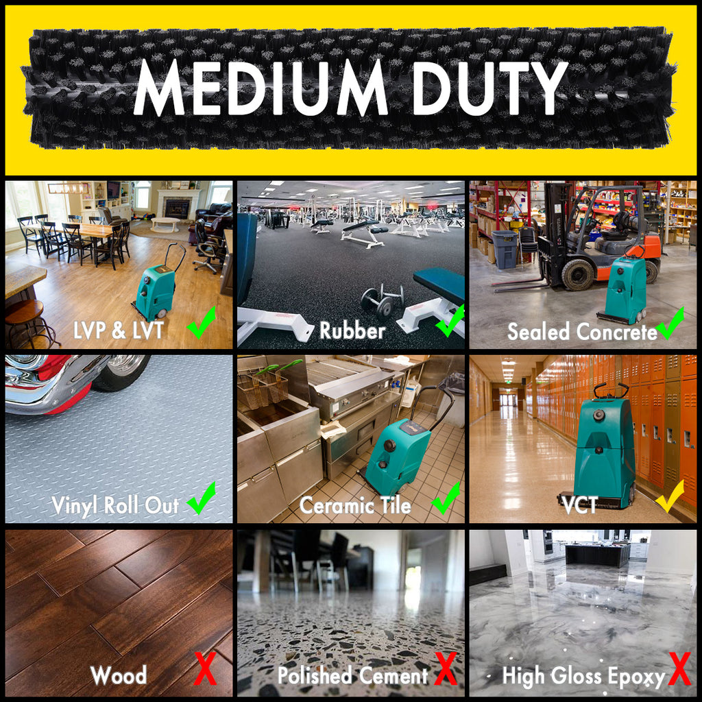 While this brush is ideal for most floor applications it has the potential to damage softer materials like wood and mar high gloss and polished surfaces. In these situations, the Light Duty Brush is the better choice.