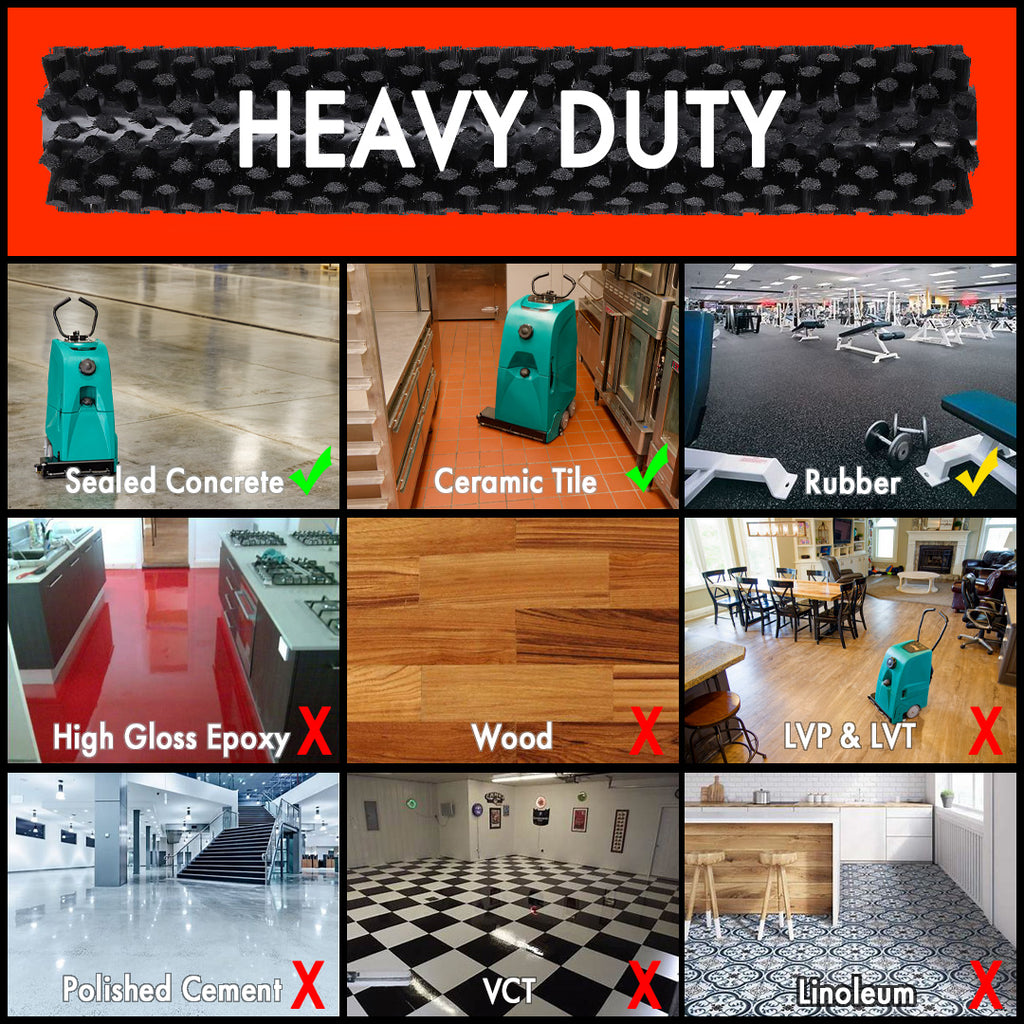 This brush does not have the standard bristles. It is a little coarser for heavier soiled areas on sealed concrete and ceramic tile. DO NOT use on softer flooring materials, such as wood or glossy and polished surfaces. The coarseness of the bristles has the potential to damage and mar these types of surfaces. For flooring types other than sealed concrete, ceramic tile and rubber a Light or Medium Duty Brush should be used.