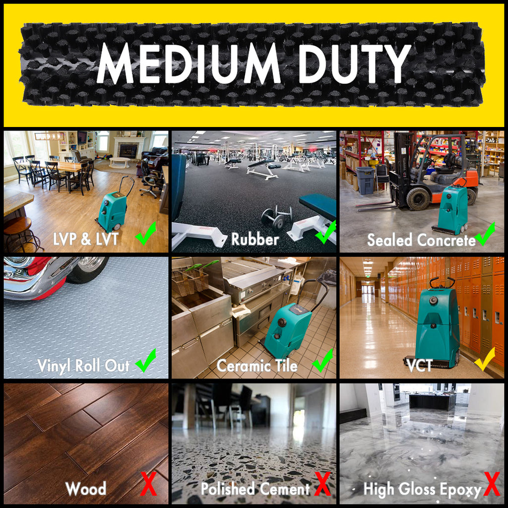 While this brush is ideal for most floor applications it has the potential to damage softer materials like wood and mar high gloss and polished surfaces. In these situations, the Light Duty Brush is the better choice.